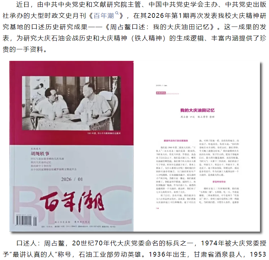 《百年潮》再次发表我校大庆精神研究基地口述历史成果并作为封面文章推荐